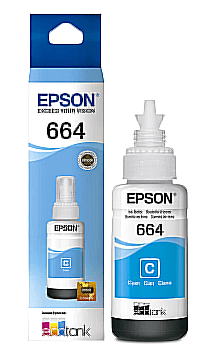 Botella de tinta Epson 664 cyan, compatible con impresoras EcoTank, recarga fácil y colores vivos.